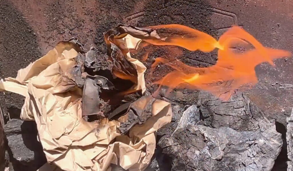 セットに入っている集光板で光を一点に集め、黒い紙と麻紐に熱を加えて火をつける流れになっています。