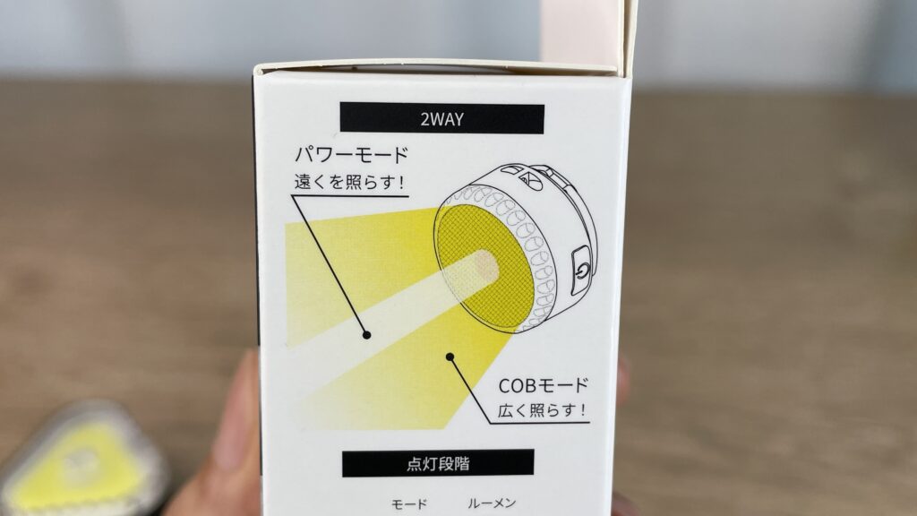 パワーモードで遠くを照らすことができ、COBモードで近くを広く照らすことができるライトです。使いたい場面に合わせて照射方法を変えられるのは、実用面でもうれしいポイントです。